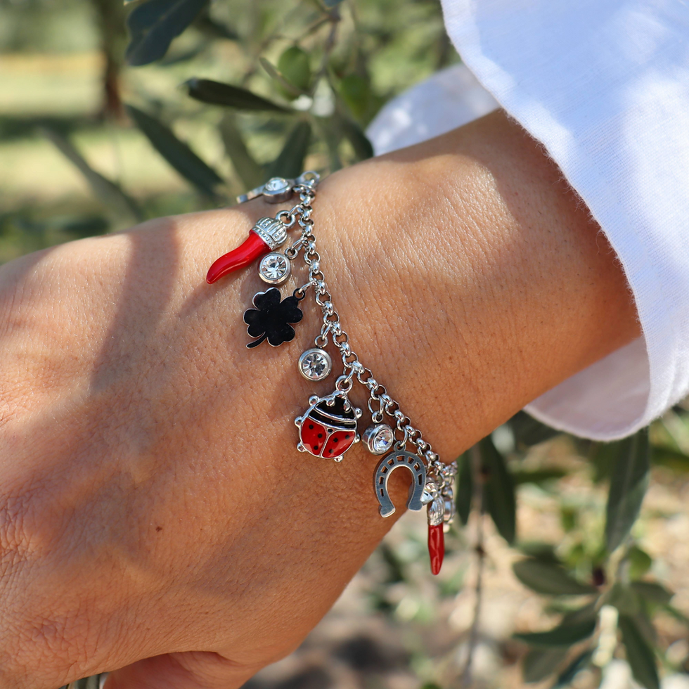 Bracelets en acier inoxydable composés de différents types de chaînes (maillon, maille forçat, maille jaseron etc...), et agrémentés d'un pendentif Corne Italienne voire plusieurs, et selon les modèles d'autres pendentifs. Tout est soudé avec la plus grande rigueur pour apporter une meilleure résistance et un niveau de finition irréprochable.